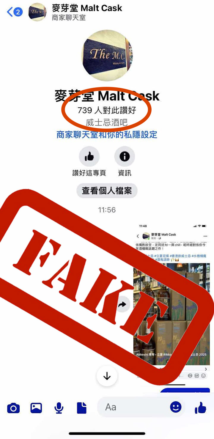 近期有假 META (Facebook)戶口冒充「麥芽堂 Malt Cask」名義,在社交平台發佈虛假優惠及低價威士忌資訊,試圖騙取客戶金錢。我們絕不會以此方式進行銷售!