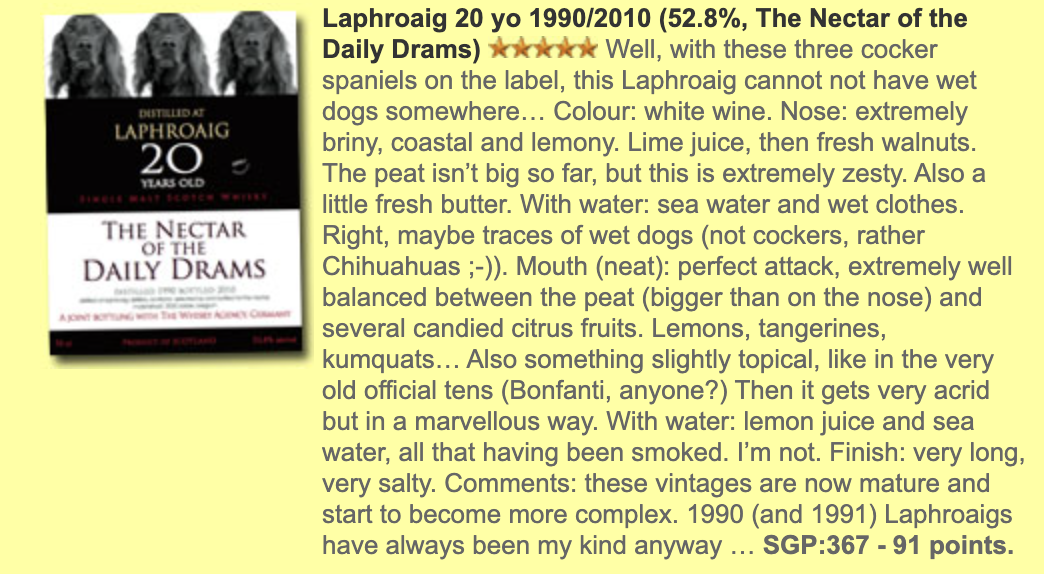 Laphroaig 1990 20YO 是由知名獨立裝瓶商 The Nectar of The Daily Drams 精選的經典艾雷威士忌,於 1990 年蒸餾,熟成 20 年後於 2010 年 裝瓶,以 52.8% 原桶強度 呈現。這款威士忌忠實展現了 Laphroaig 的經典特質,將海岸鹹香、泥煤煙燻與柑橘果香完美融合,充滿活力且層次豐富。
