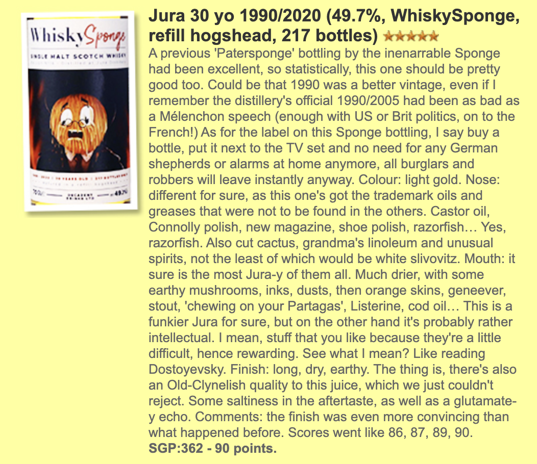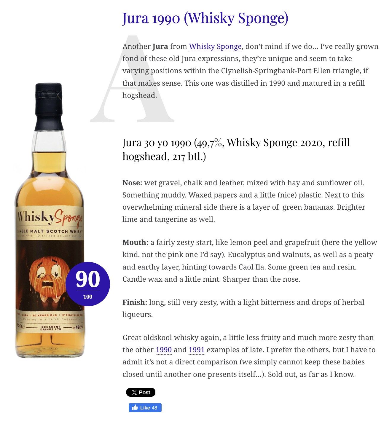 這款 Jura 1990 30YO 是 Whisky Sponge 的 Edition No.16,蒸餾於 1990 年,熟成於 Refill Hogshead(再填橡木桶),於 2020 年裝瓶,限量僅 217 瓶,酒精濃度為 49.7% ABV。30 年的熟成時光賦予這款酒礦物與果香的絕妙平衡,展現了蘇格蘭島嶼威士忌的典範。